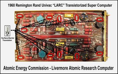 | Keywords: Univac LARC supercomputer circuit board=1960.JPG en This is a photo of a memory-read amplifier circuit board card that is from a 1960 Remington Rand Univac LARC transistorized supercomputer The original photo and copyright owner is from the website http //www vintchip com/mainframe/UNIVACLARC/UNIVACLARC html which granted me full permission to use alter or modify this photo on any Wikipedia and Wikimedia pages This original photo was enhanced and modified by me with Adobe Photoshop to show the number and locations of the Philco surface-barrier transistors that were used in this circuit board card 2010-10-04 13 55 13 own Historianbuff cc-by-sa-3 0 Attribution PD-retouched-user FAL Uploaded with UploadWizard UNIVAC |