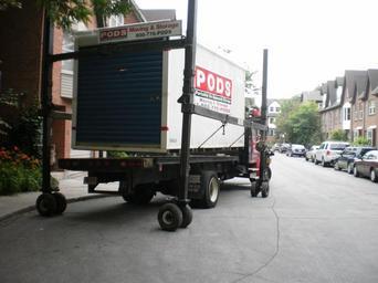 | Keywords: Unloading a shipping container with household contents -a.jpg A new neighbour was moving in and they ordered one of these pods delivered to their old address It was loaded up hoisted onto this flatbed truck using the special frame you see here; driven to the new address; and unloaded The driver had a remote control with five levers for unloading the frame Four of the levers controlled hydroaulic jacks in each of the four legs of the frame A fifth lever drove wheels that could make the frame roll forward or back own 2010-06-19 Geo Swan <span class signature-talk >talk</span> Trucks in Toronto |