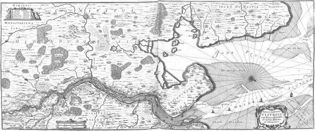 | Keywords: Unterweser Jadebusen 1643-48.jpg  la Nobilis Saxoniæ Fl Visurgis cum Terris adjacentib Ab Inclyta Brema ad ostium Maris en Saxony's noble river Weser with adjacent territories from incl Bremen to the mouth printed probably between 1643 an 1648 incuding Jade Bight de žSachsens edler Weserfluss mit angrenzenden Gebieten von einschließlich Bremen bis zur Meeresmündung <br/>Karte von Unterweser und Jadebusen <br/>anhand der Deiche am Jadebusen ist die Karte frühestens 1643 entstanden anhand der Territorialbezeichnung žDioecesis Bremensis nicht nach 1648; im Prinzip gewestet die Senkrechte liegt bei 240° zwischen SW und WSW <br/>Wegen à bereinstimmung in Details kommt als Autor Johann Conrad Musculus in Betracht <br/>Außer den Strahlen der Windrose deren Mitte hier dargestellt ist gibt es in der Meeresfläche noch Strahlen einer weiteren Windrose deren Mitte in der <u>späteren</u> Aufarbeitung von Jan van Loon enthalten ist die entsprechend weiter nach Norden reicht und dadurch zusätzlich die Insel Wangeroooge darstellt Daher darf man annehmen dass es eine Originalkart gibt deren am rechtes Ende nicht mit abgedruckt wurde damit sie in das gebundene Buch passte http //digital ub uni-duesseldorf de/ihd/content/zoom/174093 2010-06-10 original first edition as a part of Topograhia Saxoniae Inferioris by the sons of en Matthäus Merian the Elder drawn possibly by de Johann Conrad Musculus Bremen mit Vegesack 1648 cut File Karte_Unterweser jpg cut of the left lower part File Jadebusen mit Weser 9103 jpg photo of another print of the same map 4 491 × 2 288 pixels File Visurgis ab inclyta Brema ad ostium maris 1648 1653 1686 jpg relaunched by http //www vondel humanities uva nl/ecartico/persons/4722 Jan van Loon in 1685 scanned and provided by http //biblio unibe ch/web-apps/maps/lightbox php col ryh pic Ryh_5207_21 col ryh ilang DE the university of Bern Informations on the origin http //www europeana eu/portal/record/9200109/3B4793E5B61A57C7C805D886676236C631F5C916 html First edition by Merian heirs in Frankfurt in 1653 in Saxonia inferior cis-albina series Later editions with revised impressum by Jan van Loo in Amsterdam in 1686 / 1715 see http //baselbern swissbib ch/Search/Results lookfor Nobilis+Saxoni C3 A6+Fl +Visurgis+cum+Terris+adjacentib +Ab+Inclyta+Brema+ad+ostium+Maris PD-old 1640s maps Ž Old maps of dikes Old maps of Lower Saxony 1643 “1648 Maps of Jadebusen 1643 “1648 Maps of Weser 1643 “1648 Innenjade |