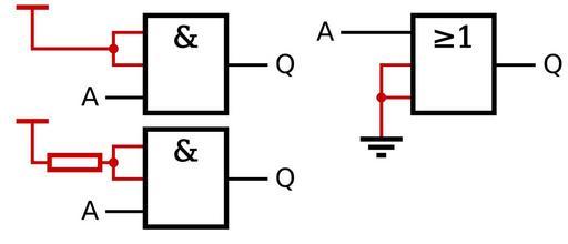 Keywords: Unused Inputs Connected To Rails.svg en A diagram showing the disabling of unused inputs red on some logic gates ANDs are disabled by tying high ORs by tying low Own Inductiveload 2009-05-02 Logic gates