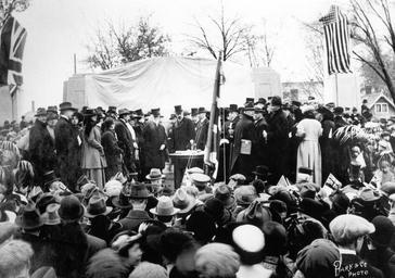 | Keywords: Unveiling of the Bell Telephone Memorial, October 24, 1917, in Brantford, Ontario Canada.jpg en From the Brantford Public Library's website <br/> Member of Parliament W F Cockshutt first broached the idea of building a memorial in honour of Alexander Graham Bell the inventor of the telephone The Bell Telephone Memorial Association was incorporated in 1906 Over 65 000 was raised through donations from the federal and provincial governments and from citizens in Brant County and elsewhere <br/> In 1908 sculptors were asked to submit plans for the memorial to the designs committee Walter S Allward of Toronto won the competition The memorial was originally supposed to be completed by 1912 but was actually not finished until five years later The site chosen for the monument was in Bell Memorial Gardens a small park bounded by Wellington King and West Streets <br/> The memorial was designed by Allward to symbolize the telephone's annihilation of space A series of steps go up to the main section where the figure Inspiration appears over a reclining male figure while the floating figures of Knowledge Joy and Sorrow are positioned at the other side At each end of the memorial there are two female figures representing humanity To commemorate the invention of the telephone by Alexander Graham Bell in 1874 is inscribed on the monument <br/> The Duke of Devonshire the Governor General of Canada unveiled this memorial on October 24 1917 Brantford Expositor October 24 1917 p 1 <br/><br/> Alexander Graham Bell made a speech and presented the Governor General with a commemorative silver telephone seen on the table centre http //brantford library on ca/archive/index php/archive/download/HistoricSitesandMonuments pdf Pg 2 Creator Park Co 1917-10-24 unknown PD-Canada PD-old Unveiling of the Bell Telephone Memorial Bell System Park Co |