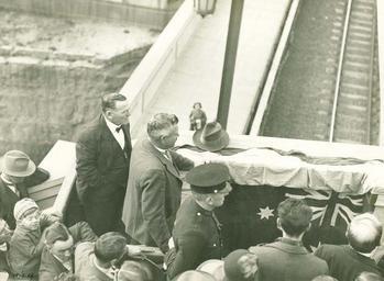 | Keywords: archives state records nsw staterecordsnsw newsouthwales blackandwhite sydney harbour bridge sydneyharbourbridge people ceremony flag officer children black and white Unveiling of Tablet to Men who lost their Lives during the building of the bridge (from the Sydney Harbour Bridge photo albums) Dated: 13/5/1932 Digital ID: 12685_a007_a00704_8724000172r Rights: www.records.nsw.gov.au/about-us/rights-and-permissions We'd love to hear from you if you use our photos/documents. Many other photos in our collection are available to view and browse on our website using Photo Investigator. Unveiling of Tablet to Men who lost their Lives during the building of the bridge (from the Sydney Harbour Bridge photo albums) Dated: 13/5/1932 Digital ID: 12685_a007_a00704_8724000172r Rights: www.records.nsw.gov.au/about-us/rights-and-permissions We'd love to hear from you if you use our photos/documents. Many other photos in our collection are available to view and browse on our website using Photo Investigator. |