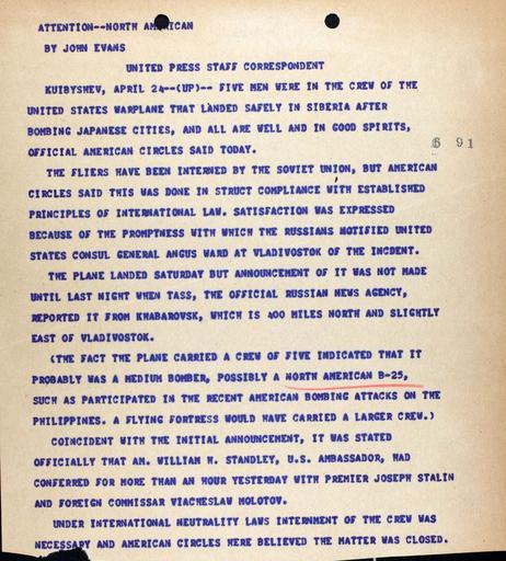 | Keywords: doolittle raid doolittleraid united press wire service unitedpresswireservice 1942 world war two worldwartwo document text Photo of a document from the 1942 United Press Wire Service Dispatches Special Collection. Repository: San Diego Air and Space Museum Archive Photo of a document from the 1942 United Press Wire Service Dispatches Special Collection. Repository: San Diego Air and Space Museum Archive | ||||