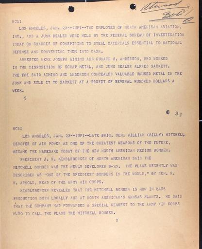 | Keywords: doolittle raid doolittleraid united press wire service unitedpresswireservice 1942 world war two worldwartwo text document writing Photo of a document from the 1942 United Press Wire Service Dispatches Special Collection. Repository: San Diego Air and Space Museum Archive Photo of a document from the 1942 United Press Wire Service Dispatches Special Collection. Repository: San Diego Air and Space Museum Archive | ||||