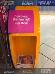 Keywords: mX Noted that there wasn't any sign encouraging users to download the mX app onto their smartphone. If there are more readers reading the papers on their smartphones, lesser papers need to be printed thus it is more environmentally friendly to Mother Earth, good for management salary and bonus. If there is a need to print a certain volume of papers to create and/or maintain jobs, what is the purpose of spending money to develop the app? Would it be a waste of money to spend on IT staff to maintain the app that has low readership? Why not try to bring readers onto the app by explicitly communicating to them with a cheap sign and thus significantly reducing printing costs? There are some booths with the advertisement to move readers to the app platform. I wish this advertisement is on all booths. trains transportation newspapers sign retail melbourne australia