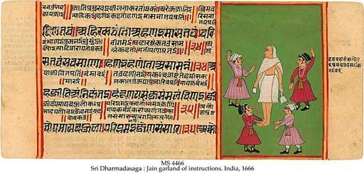 | Keywords: Upadesamala1.jpg en http //www schoyencollection com/religions htm MS in Jain Prakrit and Old Gujaranti on paper Rupnagar Rajastan India 1666 76 ff -16 ff 11x25 cm single column 10x22 cm 4 lines main text 2-4 lines of interlinear commentary for each text line in Jain Devanagari book script filled with red and yellow 17 paintings in colours mostly of Svetambara monks influenced by the Mughal style The text is a Prakrit didactic work of how best to live a proper Jain life aimed probably at the laity The Svetambara pontiff Sri Dharmadasagaî lived mid 6th c The Old Gujarati prose commentary was written in 1487 The colophon gives the place and date and the name of the religious leader Sri Namdalalaji on whose order the work was transcribed http //www schoyencollection com/religions_files/ms4466b jpg Art on Manuscript from 17th Century CE 1666 CE Category Jain manuscripts Prakrit PD-Art |