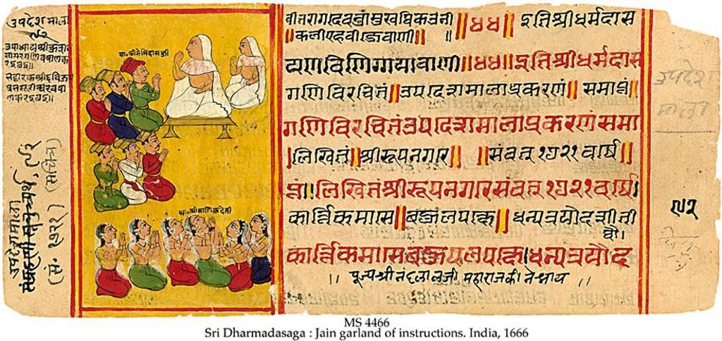 | Keywords: Upadesamala2.jpg en http //www schoyencollection com/religions htm MS in Jain Prakrit and Old Gujaranti on paper Rupnagar Rajastan India 1666 76 ff -16 ff 11x25 cm single column 10x22 cm 4 lines main text 2-4 lines of interlinear commentary for each text line in Jain Devanagari book script filled with red and yellow 17 paintings in colours mostly of Svetambara monks influenced by the Mughal style The text is a Prakrit didactic work of how best to live a proper Jain life aimed probably at the laity The Svetambara pontiff Sri Dharmadasagaî lived mid 6th c The Old Gujarati prose commentary was written in 1487 The colophon gives the place and date and the name of the religious leader Sri Namdalalaji on whose order the work was transcribed http //www schoyencollection com/religions_files/ms4466a jpg Art from 17th c manuscript 1666 CE Jain manuscripts Prakrit PD-Art |