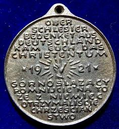 | Keywords: Upper Silesia Plebiscite 1921 Fe- Campaign Medal of the pro- German Side (reverse).jpg en Cast iron d 39 mm The Upper Silesia plebiscite was a plebiscite mandated by the Versailles Treaty and carried out in March 1921 to determine a section of the border between Weimar Germany and Poland Since the end of WW2 the whole of Upper Silesia is part of Poland Saint Hedwig of Silesia 1174 Andechs Castle Bavaria - 1243 Trzebnica Abbey Silesia Poland 2 lines divided by Saint Hedwig of Silesia ST HEDWIG SW JADWIGA / 6 lines in German above date OBER SCHLESIER BEDENKET AUS DEUTSCHLAND KAM EUCH DAS CHRISTENTUM ; 6 lines in Polish below date GÓRNOSLAZACY POMNIJCIE NA TO ZE Z NIEMIEC OTRZYMALISCIE CHRZESCIAN STWO Jaschke-Maercker 2410 Medallist Monogram TG Philipp Theodor von Gosen 1873 Augsburg - 1943 Breslau Condition UNCIRCULATED 1921-03-01 own Berlin-George other versions cc-by-sa-4 0 PD-old-70 PD-1923 Numismatics Medals of Germany Upper Silesia 1921 medals Upper Silesia plebiscite |