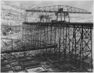 | Keywords: "Upstream concrete placing trestle with Hammerhead crane, whirley and erecting stiffleg derrick. Average height of... - NARA - 294230.jpg Scope and content Photograph from Volume Two of a series of photo albums documenting the construction of the Grand Coulee Dam and related work on the Columbia Basin Project General notes 294230 Local identifier Department of the Interior Bureau of Reclamation Engineering and Research Center 05/18/1981 - 03/04/1988 NARA's Rocky Mountain Region Denver NRGA Building 48 Denver Federal Center West 6th Avenue and Kipling Street Denver CO 80225-0307 1936-01-28 Record group Record Group 115 Records of the Bureau of Reclamation 1889 - 2008 Record group ARC 444 Photograph albums compiled 1903 - 1972 Series ARC 293611 File unit File unit ARC Variant control numbers NAIL Control Number NRG-115-CONSTPHO85006-COLBASIN2960 Other versions <gallery> File Upstream_concrete_placing_trestle_with_Hammerhead_crane _whirley_and_erecting_stiffleg_derrick _Average_height_of _-_NARA_-_294230 tif tif File Upstream_concrete_placing_trestle_with_Hammerhead_crane _whirley_and_erecting_stiffleg_derrick _Average_height_of _-_NARA_-_294230 jpg jpg </gallery> NARA-cooperation PD-USGov Construction of the Grand Coulee Dam |