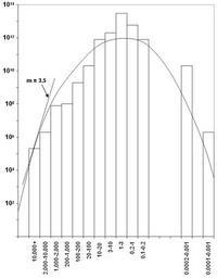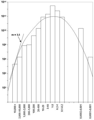 | Keywords: Uranium distribution in crust.PNG Distribution of Uranium in the Earth's crust<br> On the y axis is the amount of uranium in metric tons<br> On the x axis is the ore grade in ppm<br> The line approximates a lognormal distribution<br> Typical ores are as follows <br> Vein deposits 10 000+ ppm <br> Pegmatites unconformity deposits 2 000-10 000<br> fossil placers sand stones 1 000-2 000<br> lower grade fossil placers sandstones 200-1 000<br> volcanic deposits 100-200<br> black shales 20-100<br> shales phosphates 10-20<br> granites 3-10<br> average crust 1-3<br> evaporites siliceous ooze chert 0 2-1<br> oceanic igneous crust 0 1-0 2<br> ocean water 0 0002-0 001<br> fresh water 0 0001-0 001<br> Distribution of Uranium in the Earth's crust self-made source of data Deffeyes MacGregor World Uranium resources Scientific American Vol 242 No 1 January 1980 pp 66-76 5/11/2007 Tungsten Uranium Geochemical diagrams |