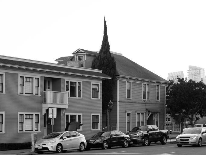 Keywords: urban city housing street cars neighborhood neighbourhood black and white