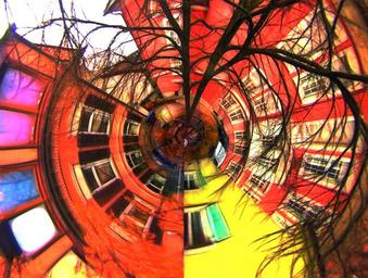 Keywords: urban courtyard modern pop art district abstract art colorful red orange turn color photo art window tree aesthetic branches