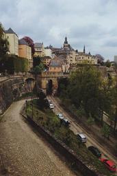 Keywords: urban hill pavement cobblestones wall buildings houses traditional historic old town city street cars steep slope view cityscape