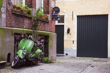 Keywords: urban scene scooter vehicle transportation street road town building architecture vintage retro brick walls cobblestone residential area houses facades small narrow