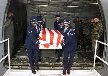 Keywords: us air force casket returning battle casualty death dead somber sad memory aircraft honor guard military