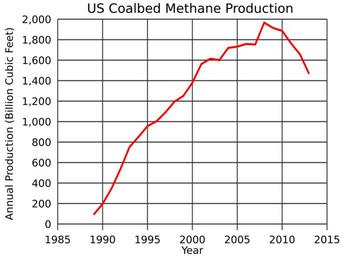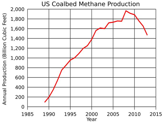 | Keywords: US Coalbed Methane Production.svg translate yes en United States coalbed methane production from 1989 to 2013 Data from http //www eia gov/dnav/ng/ng_prod_coalbed_s1_a htm EIA gaz de couche aux États-Unis ; augmentation régulière de 1990 à 2008 et déclin de 2008 à 2013 2014-12-18 own Delphi234 other versions cc-zero Uploaded with UploadWizard Coalbed methane |