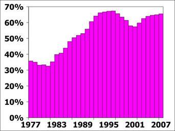| Keywords: US debt fraction of GDP growth 1977 to 2007 no titles.svg 84user Data used to create this in CSV format - click on the triangle to the right Fiscal Year Federal Spending Federal Debt Gross Domestic Product Inflation Adjustor Increase in Billions Adjusted Increase Billions Adjusted Increase Billions Adjusted Increase Debt/GDP Deb/GDP 1977 409 1 040 706 1 795 1 974 5 019 0 39 0 357640964335525 0 1978 459 1 093 0 051 776 1 850 0 031 2 217 5 285 0 053 0 42 0 350047303689688 -0 00759366064583722 1979 504 1 107 0 013 829 1 821 -0 015 2 501 5 494 0 04 0 46 0 331452493629414 -0 0185948100602739 1980 591 1 175 0 061 909 1 808 -0 008 2 727 5 422 -0 013 0 5 0 33345628919218 0 00200379556276609 1981 678 1 219 0 038 994 1 787 -0 011 3 055 5 492 0 013 0 56 0 325382374362709 -0 00807391482947062 1982 746 1 252 0 026 1 137 1 908 0 068 3 228 5 417 -0 014 0 6 0 352224478493631 0 0268421041309218 1983 808 1 294 0 034 1 371 2 195 0 15 3 441 5 510 0 017 0 62 0 398366606170599 0 0461421276769678 1984 852 1 300 0 004 1 564 2 386 0 087 3 840 5 858 0 063 0 66 0 407306247866166 0 00893964169556699 1985 946 1 396 0 074 1 817 2 680 0 123 4 142 6 108 0 043 0 68 0 438768827766863 0 0314625799006972 1986 990 1 426 0 021 2 120 3 052 0 139 4 412 6 352 0 04 0 69 0 480478589420655 0 0417097616537918 1987 1 004 1 406 -0 014 2 345 3 283 0 076 4 647 6 506 0 024 0 71 0 504611128189364 0 0241325387687088 1988 1 065 1 447 0 029 2 601 3 534 0 077 5 009 6 806 0 046 0 74 0 519247722597708 0 0146365944083442 1989 1 144 1 499 0 036 2 867 3 757 0 063 5 401 7 077 0 04 0 76 0 530874664405822 0 0116269418081137 1990 1 253 1 590 0 061 3 206 4 067 0 083 5 735 7 277 0 028 0 79 0 558884155558609 0 0280094911527876 1991 1 324 1 610 0 013 3 598 4 374 0 075 5 935 7 215 -0 008 0 82 0 606237006237006 0 047352850678397 1992 1 382 1 624 0 009 4 001 4 703 0 075 6 240 7 334 0 017 0 85 0 641259885464958 0 0350228792279514 1993 1 410 1 615 -0 005 4 351 4 987 0 06 6 576 7 536 0 028 0 87 0 661756900212314 0 0204970147473565 1994 1 462 1 642 0 017 4 643 5 216 0 046 6 961 7 820 0 038 0 89 0 667007672634271 0 00525077242195682 1995 1 516 1 662 0 012 4 920 5 395 0 034 7 326 8 033 0 027 0 91 0 671604630897548 0 00459695826327655 1996 1 561 1 673 0 007 5 181 5 554 0 03 7 694 8 248 0 027 0 93 0 673375363724539 0 00177073282699169 1997 1 601 1 684 0 007 5 369 5 647 0 017 8 182 8 606 0 043 0 95 0 656170113874041 -0 017205249850498 1998 1 653 1 721 0 022 5 478 5 704 0 01 8 628 8 985 0 044 0 96 0 634835837506956 -0 0213342763670853 1999 1 702 1 746 0 015 5 605 5 750 0 008 9 125 9 361 0 042 0 97 0 614250614250614 -0 0205852232563418 2000 1 789 1 789 0 025 5 628 5 628 -0 021 9 710 9 710 0 037 1 0 579608650875386 -0 0346419633752281 2001 1 863 1 821 0 018 5 769 5 638 0 002 10 058 9 829 0 012 1 02 0 573608708922576 -0 00599994195281006 2002 2 011 1 929 0 06 6 198 5 945 0 055 10 377 9 954 0 013 1 04 0 597247337753667 0 0236386288310908 2003 2 160 2 018 0 046 6 760 6 316 0 062 10 809 10 099 0 014 1 07 0 6254084562828 0 0281611185291334 2004 2 293 2 082 0 032 7 354 6 677 0 057 11 500 10 441 0 034 1 1 0 639498132362801 0 0140896760800002 2005 2 472 2 165 0 04 7 905 6 923 0 037 12 238 10 717 0 026 1 14 0 645983017635532 0 00648488527273183 2006 2 655 2 249 0 039 8 451 7 158 0 034 13 016 11 024 0 029 1 18 0 649310595065312 0 00332757742977974 2007 2 730 2 263 0 006 8 951 7 419 0 036 13 668 11 329 0 028 1 21 0 654868037779151 0 00555744271383873 Government debt-to-GDP ratio of the United States |
