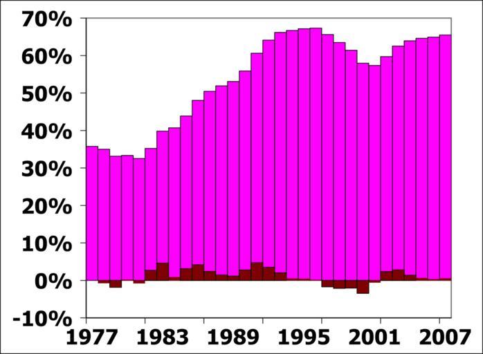 | Keywords: US debt fraction of GDP growth 1977 to 2007 changes no titles.svg 84user Data used to create this in CSV format - click on the triangle to the right Fiscal Year Federal Spending Federal Debt Gross Domestic Product Inflation Adjustor Increase in Billions Adjusted Increase Billions Adjusted Increase Billions Adjusted Increase Debt/GDP Deb/GDP 1977 409 1 040 706 1 795 1 974 5 019 0 39 0 357640964335525 0 1978 459 1 093 0 051 776 1 850 0 031 2 217 5 285 0 053 0 42 0 350047303689688 -0 00759366064583722 1979 504 1 107 0 013 829 1 821 -0 015 2 501 5 494 0 04 0 46 0 331452493629414 -0 0185948100602739 1980 591 1 175 0 061 909 1 808 -0 008 2 727 5 422 -0 013 0 5 0 33345628919218 0 00200379556276609 1981 678 1 219 0 038 994 1 787 -0 011 3 055 5 492 0 013 0 56 0 325382374362709 -0 00807391482947062 1982 746 1 252 0 026 1 137 1 908 0 068 3 228 5 417 -0 014 0 6 0 352224478493631 0 0268421041309218 1983 808 1 294 0 034 1 371 2 195 0 15 3 441 5 510 0 017 0 62 0 398366606170599 0 0461421276769678 1984 852 1 300 0 004 1 564 2 386 0 087 3 840 5 858 0 063 0 66 0 407306247866166 0 00893964169556699 1985 946 1 396 0 074 1 817 2 680 0 123 4 142 6 108 0 043 0 68 0 438768827766863 0 0314625799006972 1986 990 1 426 0 021 2 120 3 052 0 139 4 412 6 352 0 04 0 69 0 480478589420655 0 0417097616537918 1987 1 004 1 406 -0 014 2 345 3 283 0 076 4 647 6 506 0 024 0 71 0 504611128189364 0 0241325387687088 1988 1 065 1 447 0 029 2 601 3 534 0 077 5 009 6 806 0 046 0 74 0 519247722597708 0 0146365944083442 1989 1 144 1 499 0 036 2 867 3 757 0 063 5 401 7 077 0 04 0 76 0 530874664405822 0 0116269418081137 1990 1 253 1 590 0 061 3 206 4 067 0 083 5 735 7 277 0 028 0 79 0 558884155558609 0 0280094911527876 1991 1 324 1 610 0 013 3 598 4 374 0 075 5 935 7 215 -0 008 0 82 0 606237006237006 0 047352850678397 1992 1 382 1 624 0 009 4 001 4 703 0 075 6 240 7 334 0 017 0 85 0 641259885464958 0 0350228792279514 1993 1 410 1 615 -0 005 4 351 4 987 0 06 6 576 7 536 0 028 0 87 0 661756900212314 0 0204970147473565 1994 1 462 1 642 0 017 4 643 5 216 0 046 6 961 7 820 0 038 0 89 0 667007672634271 0 00525077242195682 1995 1 516 1 662 0 012 4 920 5 395 0 034 7 326 8 033 0 027 0 91 0 671604630897548 0 00459695826327655 1996 1 561 1 673 0 007 5 181 5 554 0 03 7 694 8 248 0 027 0 93 0 673375363724539 0 00177073282699169 1997 1 601 1 684 0 007 5 369 5 647 0 017 8 182 8 606 0 043 0 95 0 656170113874041 -0 017205249850498 1998 1 653 1 721 0 022 5 478 5 704 0 01 8 628 8 985 0 044 0 96 0 634835837506956 -0 0213342763670853 1999 1 702 1 746 0 015 5 605 5 750 0 008 9 125 9 361 0 042 0 97 0 614250614250614 -0 0205852232563418 2000 1 789 1 789 0 025 5 628 5 628 -0 021 9 710 9 710 0 037 1 0 579608650875386 -0 0346419633752281 2001 1 863 1 821 0 018 5 769 5 638 0 002 10 058 9 829 0 012 1 02 0 573608708922576 -0 00599994195281006 2002 2 011 1 929 0 06 6 198 5 945 0 055 10 377 9 954 0 013 1 04 0 597247337753667 0 0236386288310908 2003 2 160 2 018 0 046 6 760 6 316 0 062 10 809 10 099 0 014 1 07 0 6254084562828 0 0281611185291334 2004 2 293 2 082 0 032 7 354 6 677 0 057 11 500 10 441 0 034 1 1 0 639498132362801 0 0140896760800002 2005 2 472 2 165 0 04 7 905 6 923 0 037 12 238 10 717 0 026 1 14 0 645983017635532 0 00648488527273183 2006 2 655 2 249 0 039 8 451 7 158 0 034 13 016 11 024 0 029 1 18 0 649310595065312 0 00332757742977974 2007 2 730 2 263 0 006 8 951 7 419 0 036 13 668 11 329 0 028 1 21 0 654868037779151 0 00555744271383873 Government debt-to-GDP ratio of the United States |