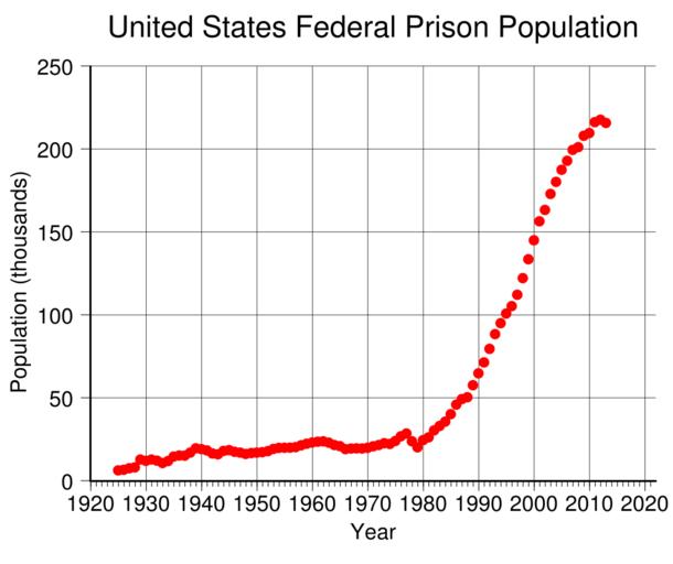 | Keywords: US federal prison population.svg en United States federal prison population 1925-1979 Historical Statistics on Prisoners https //www ncjrs gov/pdffiles1/digitization/111098ncjrs pdf NCJ-111098 2003-2013 Prisoners In 2013 http //www bjs gov/index cfm ty pbdetail iid 5109 NCJ 247282 BJS http //www bjs gov/index cfm ty pbse sid 40 Prisoners This chart may be updated with data from 1891 to present each year 2014-11-07 own Delphi234 current annually Generated with Wikimedia SVG Chart 1 cc-zero Uploaded with UploadWizard Correctional population statistics for the United States Federal prisons in the United States Created with Wikimedia SVG Chart |