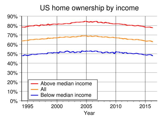 Keywords: US Home Ownership by Income.svg en Home ownership by income in the United States from 1994 to 2016 Data from US Census Bureau http //www census gov/housing/hvs/data/histtabs html Table 17 2016-09-06 own Delphi234 other versions current quarterly Generated with Wikimedia SVG Chart SVG Chart/box cc-zero Home ownership rates |