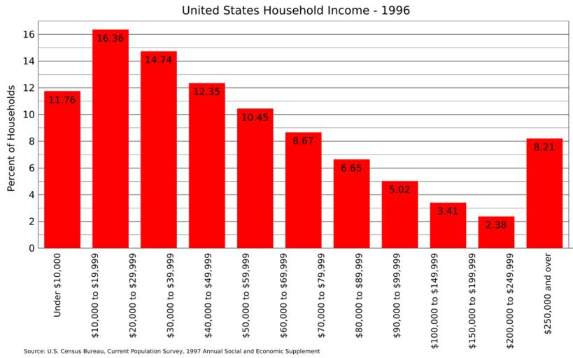 Keywords: US household income 1996.svg en US household income distribution for 1996 Data from https //www census gov/hhes/www/income/data/incpovhlth/1996/index html Money Income in the United States 1996 2016-03-15 own Delphi234 other versions cc-zero Income distribution in the United States |