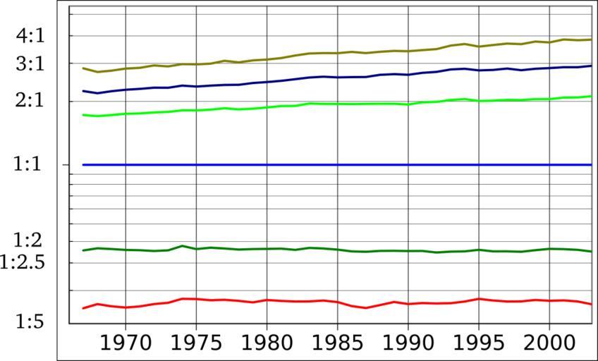 | Keywords: US Income Inequality 1967-2003 relative to median (log scale).svg US income by percentile relative to median 1967 “2003 log chart own ; graphed in Gnumeric labels added in Inkscape Created with Inkscape 2010-03-05 Nils R Barth w File United States Income Distribution 1967-2003 svg “ same data source but raw dollar figures not ratios Data source The data source is cite web http //www census gov/prod/2004pubs/p60-226 pdf Table A-3 Selected Measures of Household Income Dispersion 1967 to 2003 2007-06-16 2004 08 DeNavas-Walt Carmen Bernadette D Proctor Robert J Mills PDF Income Poverty and Health Insurance Coverage in the United States 2003 U S Census Bureau 36-37 English Income Poverty and Health Insurance Coverage in the United States 2003 Carmen DeNavas-Walt Bernadette D Proctor Robert J Mills August 2004 U S Census Bureau U S Department of Commerce Table A-3 Selected Measures of Household Income Dispersion 1967 to 2003 pages 36-37 Household Income at Selected Percentiles Percentile median Year 10th 20th 50th 80th 90th 95th 1967 7790 14002 33338 55265 70443 88678 1968 8472 14912 34746 56937 71799 89076 1969 8600 15369 36074 59772 76117 93743 1970 8435 15126 35832 60148 76719 95090 1971 8446 14927 35463 59708 76599 94818 1972 9009 15434 36953 62878 80793 101215 1973 9314 15844 37700 64500 82360 102243 1974 9401 16064 36537 63477 81577 101433 1975 9125 15143 35559 61765 78652 98484 1976 9168 15615 36155 63247 80701 100839 1977 9259 15573 36359 64564 81742 104377 1978 9745 16398 38693 67874 87110 109348 1979 9589 16457 38649 68318 88588 111445 1980 9515 15977 37447 67028 86692 108894 1981 9280 15772 36868 66878 86401 108822 1982 9216 15548 36811 66920 87717 111516 1983 9167 15769 36593 68154 88712 113187 1984 9542 16175 37767 70092 92299 117253 1985 9583 16306 38510 71433 93483 119459 1986 9526 16586 39868 73853 97043 125264 1987 9452 16724 40357 74893 98333 125321 1988 9817 17006 40678 75593 101339 127958 1989 10315 17329 41411 76946 103865 131443 1990 9965 17059 40865 75341 101857 129307 1991 9776 16580 39679 74759 100833 126969 1992 9655 16190 39364 74533 101023 127230 1993 9635 16256 39165 75594 103010 131178 1994 9914 16484 39613 77154 104890 134835 1995 10501 17261 40845 78061 106436 135448 1996 10474 17239 41431 79395 108450 139541 1997 10588 17601 42294 81719 112241 144636 1998 10979 18164 43825 84529 114396 148995 1999 11420 18915 44922 87459 118969 156744 2000 11304 19142 44853 87341 119636 155121 2001 11105 18674 43882 86771 118080 156395 2002 10863 18326 43381 85941 116726 153438 2003 10536 17984 43318 86867 118200 154120 Economic trends Income distribution in the United States cc-zero |