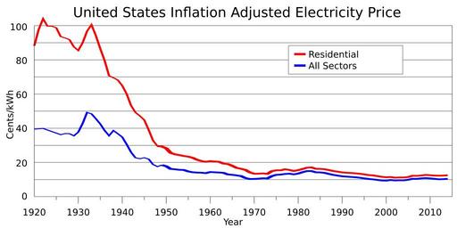 | Keywords: US inflation adjusted electricity prices.svg translate yes en United States inflation adjusted electricity prices from 1920 to 2014 comparing residential with all sectors Data is from EIA Electric Power Monthly Table 5 3 http //www eia gov/electricity/monthly/ US Census data http //www census gov/history/pdf/histstats-colonial-1970 pdf Page 827 and http //www census gov/compendia/statab/2012/tables/12s0947 xls CPI from http //www bls gov/data/ 2014-09-18 own Delphi234 File US electricity prices svg current annually cc-zero Uploaded with UploadWizard Electricity prices in the United States |