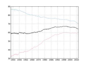 | Keywords: US Labor Participation Rate 1948-2011 by gender.svg validSVG en Graph of US Civilian Labor Participation Rate from 1948 to 2011 by gender Men are represented in light blue women in pink and the total in black Bureau of Labor Statistics within the United States Department of Labor User Int21h 2011-10-08 cc-zero thumbthumb Source code <source lang python > /usr/bin/env python Create an SVG graph of BLS timeseries data using matplotlib and BeautifulSoup import matplotlib figure import datetime import bs4 import matplotlib backends backend_cairo import string import urllib2 def main url 'http //data bls gov/timeseries/ s years_option specific_years include_graphs true to_year 2011 from_year 1948' total_series 'LNS11300000' men_series 'LNS11300001' women_series 'LNS11300002' fig ax init_figure add_plot ax scrape_bls bs4 BeautifulSoup urllib2 urlopen url total_series 'black' add_plot ax scrape_bls bs4 BeautifulSoup urllib2 urlopen url men_series 'lightblue' add_plot ax scrape_bls bs4 BeautifulSoup urllib2 urlopen url women_series 'pink' save_figure fig 'US Labor Participation Rate 1948-2011 by gender svg' Scrape the BLS soup for the data def scrape_bls soup table soup find_all 'table' attrs 'class' 'regular-data' assert len table 1 table table0 data years_lc t for t in r if type t is bs4 element Tag for r in table contents4 if type r is bs4 element Tag for row in years_lc year int row0 text months float t text for t in row1 if any c in string printable and c ' ' for c in t text data append year months return data Add plot to figure Extra parameters are passed to matplotlib axes Axes plot def add_plot axis data args x y for year months in data for month n in enumerate months x append datetime date year month+1 1 y append n axis plot x y args Initialize figure def init_figure figure matplotlib figure Figure axis figure add_subplot 111 axis xaxis set_major_locator matplotlib dates YearLocator 6 axis xaxis set_major_formatter matplotlib dates DateFormatter ' Y' axis grid True return figure axis Save figure def save_figure figure filename figure canvas matplotlib backends backend_cairo FigureCanvasCairo figure figure savefig filename transparent True if __name__ __main__ main </source> Labour Economic information graphics Economy of the United States SVG charts in English Sociological trend graphs |