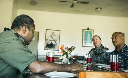| Keywords: US military works with Fijian military forces to improve healthcare capabilities during Pacific Partnership 2015 150608-N-TQ272-106.jpg en SUVA Fiji June 08 2015 - Lt Col Eliki Nanovu a chief of medicine in the Republic of Fiji Military Force has dinner with Australian and U S service members assigned to the hospital ship USNS Mercy T-AH 19 during Pacific Partnership 2015 Mercy is currently in Suva Fiji for its first mission port of PP15 Pacific Partnership is in its 10th iteration and is the largest annual multilateral humanitarian assistance and disaster relief preparedness mission conducted in the Indo-Asia-Pacific region While training for crisis conditions Pacific Partnership missions to date have provided real world medical care to approximately 270 000 patients and veterinary services to more than 38 999 animals Additionally the mission has provided critical infrastructure development to host nations through more than 180 engineering projects U S Navy photo by Mass Communication Specialist 2nd Class Mark El-Rayes/Released 2015-06-08 Petty Officer 2nd Class Mark El-Rayes https //www dvidshub net/image/1984518 150608-N-TQ272-106 2015-06-09 00 52 SUVA FJ PD-USGov-Military-Navy USNS Mercy T-AH-19 Pacific Partnership 2015 Images from DoD uploaded by Fæ |