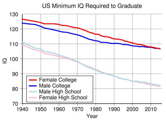 Keywords: US Minimum IQ Required to Graduate.svg en As the percentage of graduates increases the minimum IQ to include at least that percentage of graduates inherently decreases Since 2000 the intelligence required to be a college graduate has been less than the intelligence required to graduate from high school in 1940 based on a standard distribution Data from https //www census gov/hhes/socdemo/education/data/cps/historical/index html US Census 2016-08-04 own Delphi234 other versions Generated with Wikimedia SVG Chart SVG Chart/box cc-zero Educational attainment statistics for the United States Intelligence quotient |
