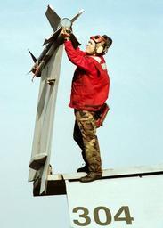 | Keywords: US Navy 020213-N-5920M-008 Aviation Ordnanceman Checks AIM-9 Missile.jpg en 020213-N-5920M-008 At sea aboard USS Theodore Roosevelt CVN 71 Feb 13 2002 -- An Aviation Ordnanceman from Strike Fighter Squadron Eight Two VFA-82 Marauders checks an AIM-9 Sidewinder Air-to-Air missile on an F/A-18 Hornet The Marauders are part of Carrier Air Wing One CVW 1 currently deployed with USS Theodore Roosevelt CVN 71 in support of Operation Enduring Freedom U S Navy photo by Photographer s Mate Airman Marla E Martinez-Cintron RELEASED 2002-02-13 020213-N-5920M-008 Navy http //www navy mil/view_image asp id 808 U S Navy photo by Photographer s Mate Airman Marla E Martinez-Cintron PD-USGov-Military-Navy 13 February 2002 events in the United States February 2002 photographs February 2002 in the United States Military people in 2002 Aboard USS Theodore Roosevelt CVN-71 AIM-9 Sidewinder Aviation Ordnanceman 304 number Personality rights Strike Fighter Squadron 82 United States Navy |