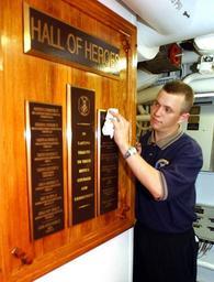 | Keywords: US Navy 020418-N-1110A-505 Hall of Heroes aboard USS Cole.jpg en Northrop Grumman Ship Systems NGSS Pascagoula MS Apr 18 2002 -- Mess Specialist Seaman Len Edwards puts the finishing touches on a large brass plaque bearing the names of each Sailor killed in the October 12 2000 terrorist attack while the ship was refueling in the port city of Aden Yemen The plaque represents a centerpiece for newly completed Hall of Heroes aboard ship The Cole has been in Pascagoula for the past 14 months undergoing repairs and is scheduled to begin a return to her homeport of Norfolk Virginia on April 19 2002 U S Navy photo by Photographer s Mate 1st Class Tina M Ackerman RELEASED 2002-04-18 020418-N-1110A-505 JPG Navy http //www navy mil/view_image asp id 1307 U S Navy photo by Photographer s Mate 1st Class Tina M Ackerman PD-USGov-Military-Navy 18 April 2002 in Mississippi April 2002 photographs Aboard USS Cole DDG-67 April 2002 in the United States Images related to the USS Cole bombing Male soldiers Men at work Military people in 2002 Northrop Grumman Shipbuilding Pascagoula Military people on duty Personality rights |