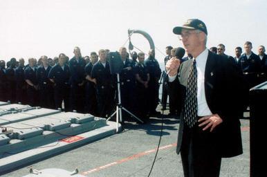 | Keywords: US Navy 020419-N-0000F-001 SECNAV aboard USS Cape St. George.jpg en At sea aboard the cruiser USS Cape St George CG 71 Apr 19 2002 -- The Secretary of the Navy the Honorable Gordon R England addresses crewmembers of the Norfolk Va - based cruiser thanking them for their dedicated service The Secretary who flew out to the ship while it was in the Gulf of Mexico emphasized the need to maintain focus as the United States and our friends and allies combat international terrorism under the leadership of President Bush and the nation's leadership Mr England rode the ship into port for a scheduled stop in Pensacola FL U S Navy photo by Photographer's Mate 1st Class Joe Fata RELEASED 2002-04-19 020419-N-0000F-001 Navy http //www navy mil/view_image asp id 1377 U S Navy photo by Photographer's Mate 1st Class Joe Fata PD-USGov-Military-Navy USS Cape St George CG-71 Gordon R England |