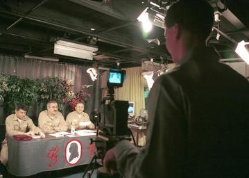 | Keywords: US Navy 020422-N-9573A-001 USS Washington - Captain's Call.jpg en At sea aboard USS George Washington CVN 73 Apr 22 2002 -- Journalist 2nd Class John Osborne from Frankfort KY runs a television camera during a live broadcast of Captain's Call Seated on the panel are executive officer Capt Kevin Donegan commanding officer Capt Martain Erdossy and command master chief Master Chief Mike McCalip Washington is homeported in Norfolk VA and is conducting integrated training exercises in the Atlantic Ocean U S Navy photo by Photographer's Mate 3rd Class Bobbie Attaway RELEASED 2002-04-22 020422-N-9573A-001 Navy http //www navy mil/view_image asp id 1338 U S Navy photo by Photographer's Mate 3rd Class Bobbie Attaway PD-USGov-Military-Navy Aboard USS George Washington CVN-73 |