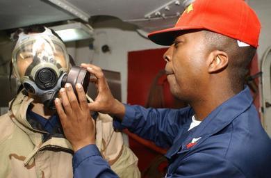 | Keywords: US Navy 020423-N-0685W-004 USS Kitty Hawk - damage control training.jpg en At sea aboard USS Kitty Hawk CV 63 Apr 23 2002 -- Damage Control Training Team member Storekeeper 1st Class Kerry Bean right from Bruce MS and Aviation Storekeeper Airman Ying Guan from Los Angeles CA discuss and demonstrate the proper use of a C2 canister and its proper gas mask assembly during a general quarters training exercise Kitty Hawk is providing a forward presence in the Asia-Pacific region conducting training and exercises with its regional allies Kitty Hawk is the Navy s only permanently forward-deployed aircraft carrier operating out of Yokosuka Japan U S Navy photo by Photographer s Mate Airman Jo Wilbourn RELEASED 2002-04-23 020423-N-0685W-004 Navy http //www navy mil/view_image asp id 1371 U S Navy photo by Photographer s Mate Airman Jo Wilbourn PD-USGov-Military-Navy Aboard USS Kitty Hawk CV-63 |