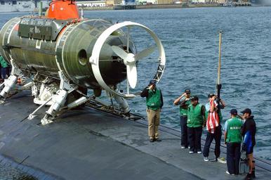 | Keywords: US Navy 020425-N-0401E-001 DSRV-1 on board USS La Jolla.jpg en Sasebo Japan Apr 25 2002 -- The U S Navy Los Angeles attack submarine USS La Jolla SSN 701 with the deep submergence rescue vehicle Mystic DSRV-1 attached lowers the National Ensign as it prepares to get underway to participate in the submarine rescue Exercise Pacific Reach 2002 La Jolla and Mystic will operate with surface ships and submarines from the U S Japan Australia the Republic of Korea and the Republic of Singapore during Exercise Pacific Reach Mystic was specifically designed to fill the need for an improved means of rescuing the crew of a submarine immobilized on the ocean floor It can operate independently of surface conditions or under ice for rapid response to an accident anywhere in the world U S Navy photo by Journalist 3rd Class Wes Eplen RELEASED 2002-04-25 020425-N-0401E-001 Navy http //www navy mil/view_image asp id 1364 U S Navy photo by Journalist 3rd Class Wes Eplen PD-USGov-Military-Navy DSRV-1 Mystic submarine 1970 Sasebo Nagasaki USS La Jolla SSN-701 Pacific Reach 2002 April 2002 photographs April 2002 in Japan Military people in 2002 Photographs of flags of the United States Taken with Fujifilm FinePix S1 Pro Military people with a flag of the United States Salutes to flags of the United States Flag hoisting 25 April Personality rights |
