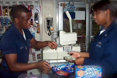| Keywords: US Navy 020615-N-1711I-001 SHSA Black aboard USS Wasp (LHD 1).jpg en At sea aboard USS Wasp LHD 1 Jun 15 2002 -- Ship s Serviceman Seaman Apprentice Brian Black from Matthews N C completes a sale in the ship's store with customer Quartermaster 3rd Class Allatia Hosely from Albany GA Seaman Black s top-notch customer service skills came to the attention of his leading chief petty officer LCPO who assigned him to work as a cashier in the ship's store The Wasp is on a scheduled six-month deployment in support of Operation Enduring Freedom U S Navy photo by Signalman 3rd Class Derrick M Ingle RELEASED 2002-06-15 020615-N-1711I-001 Navy http //www navy mil/view_image asp id 1730 U S Navy photo by Signalman 3rd Class Derrick M Ingle PD-USGov-Military-Navy African American sailors Female sailors June 2002 in the United States 15 June Aboard USS Wasp LHD-1 June 2002 photographs Sailors at sea Military people in 2002 Male soldiers Personality rights |