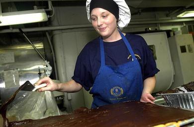 | Keywords: US Navy 020717-N-2781V-008 USS Washington - food preps.jpg en At sea aboard USS George Washington CVN 73 Jul 17 2002 -- Mess Management Specialist Seaman Chelsea Smith puts the finishing touches on a cake prepared for the ship s crew George Washington is on a scheduled six-month deployment conducting missions in support of Operation Enduring Freedom U S Navy photo by Journalist 2nd Class David Valdez RELEASED 2002-07-17 020717-N-2781V-008 Navy http //www navy mil/view_image asp id 1949 U S Navy photo by Journalist 2nd Class David Valdez PD-USGov-Military-Navy Aboard USS George Washington CVN-73 |