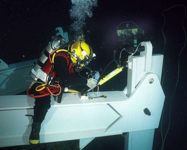 Keywords: US Navy 020723-N-7479T-002 Navy diver conducts deep sea salvage operations.jpg en At sea off the coast of Cape Hateras N C July 21 2002 -- Hull Technician 1st Class John Coffelt works on a hydraulic ram as a remote operated vehicle ROV looks on during a dive on the sunken Civil War Ironclad USS Monitor which rests 230 feet below the ocean's surface The ram will be used to articulate a leg of the spider apparatus that will lift the turret U S Navy photo by Chief Photographer s Mate Eric J Tilford RELEASED 2002-07-21 020723-N-7479T-002 Navy http //www navy mil/view_image asp id 2118 U S Navy photo by Chief Photographer s Mate Eric J Tilford PD-USGov-Military-Navy Images from US Navy location Off the coast of Cape Hatteras N C Underwater photographs of surface supplied divers Remotely operated underwater vehicles Hydraulic cylinders USS Monitor ship 1862 Underwater work July 2002 photographs |