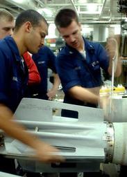 | Keywords: US Navy 020807-N-7871M-001 Sailors aboard CVN 73 dismantal a MK-82 bomb in one of the ship's magazines.jpg en At sea aboard USS George Washington CVN 73 Aug 7 2002 -- Airman Roosevelt Hall left from Los Angeles CA and Aviation Ordnanceman 3rd Class Charles Wisneski from Little Fort NY remove a bomb stabilizing unit from a MK-82 500 pound bomb in one of the ship's weapons magazines The Washington battlegroup is on a regularly scheduled deployment conducting missions in support of Operation Enduring Freedom U S Navy photo by Photographer's Mate Airman Andrew Morrow RELEASED 2002-08-07 020807-N-7871M-001 Navy http //www navy mil/view_image asp id 2216 U S Navy photo by Photographer's Mate Airman Andrew Morrow PD-USGov-Military-Navy Aboard USS George Washington CVN-73 Mark 82 bomb August 2002 photographs Military people in 2002 August 2002 in the United States Photographs of standing men Men at work in the United States Sailors at sea Military people on duty Male soldiers Personality rights |