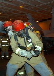 | Keywords: US Navy 020823-N-6433N-001 Hose team trains during a GQ drill.jpg en At sea aboard USS George Washington CVN 73 Aug 23 2002 -- Lithographer 3rd Class Jason Brown from Columbia S C leads a hose team to a simulated fire during a General Quarters drill in the ship s hangar bay George Washington and her embarked Carrier Air Wing Seventeen CVW-17 are on a six-month deployment conducting combat missions in support of Operation Enduring Freedom U S Navy photo by Photographer s Mate Airman Rex Nelson RELEASED 2002-08-23 020823-N-6433N-001 Navy http //www navy mil/view_image asp id 2434 U S Navy photo by Photographer s Mate Airman Rex Nelson PD-USGov-Military-Navy Aboard USS George Washington CVN-73 August 2002 photographs |