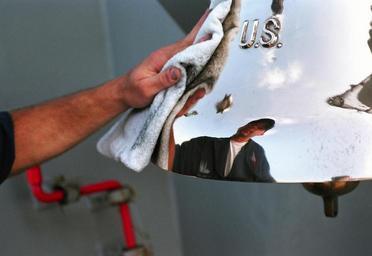 | Keywords: US Navy 020828-N-4151K-011 Sailor polishes ship's bell.jpg en At sea aboard the guided missile destroyer USS Higgins DDG 76 Aug 28 2002 -- Mess Management Specialist 2nd Class Kevin M Lebahn from Spokane Wash polishes the ship s bell on the weather decks aboard the guided missile destroyer Considered a symbol of pride and tradition aboard all ships of the fleet bells have a centuries-long tradition of varied use in the navies and merchant fleets of the world They have been used for signaling keeping time and providing alarm Their functional and ceremonial uses have made them a symbol of considerable significance to the United States Navy and remain the property of the U S Government and Navy following a ship s decommissioning U S Navy photo by Photographer s Mate Lance Kirk RELEASED 2002-08-28 020828-N-4151K-011 Navy http //www navy mil/view_image asp id 2740 U S Navy photo by Photographer s Mate Lance Kirk PD-USGov-Military-Navy USS Higgins DDG-76 Ships' bells August 2002 photographs |