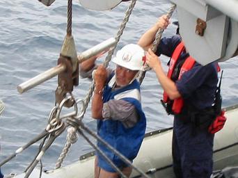 | Keywords: US Navy 020917-N-0000X-019 Rescue at sea by USS McClusky FFG 41.jpg en At Sea off the coast of Costa Rica Sep 17 2002 -- Crewmembers assist 62-year-old Richard Van Pham center aboard the U S Navy frigate USS McClusky FFG 41 from one of the ship s ridged hull inflatable boats RHIB after rescuing Van Pham from his battered and broken sailboat Military aircraft conducting drug interdiction operations in the region spotted the boat adrift and alerted nearby ships for assistance Van Pham was rescued by McClusky after being adrift for 3 1/2 months Van Pham set out for a short trip between Long Beach Calif and Catalina Island when high winds damaged his mast disabling his boat U S Navy Photo RELEASED 2002-09-17 020917-N-0000X-019 Navy http //www navy mil/view_image asp id 2791 U S Navy photo PD-USGov-Military-Navy Images from US Navy location At Sea off the coast of Costa Rica USS McClusky FFG-41 |