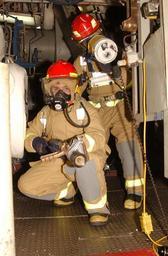 | Keywords: US Navy 021104-N-0685W-008 Damage control leader during a General Quarters (GQ) drill, checks a space for potential reflash fires using a thermal imager.jpg en At sea aboard USS Kitty Hawk CV 63 Nov 4 2002 -- Damage Controlman 2nd Class Kyle Nordlund from Clearbrook Minn damage control leader during a General Quarters GQ drill checks a space for potential reflash fires using a thermal imager while the 1 Nozzleman kneeling Hull Maintenance Technician Fireman Lloyd Dieckman from Oak Harbor Wash provides firefighting cover Thermal imaging technology has a dramatically improved shipboard search and rescue efforts encountered in the tight spaces aboard ship Navy firefighters using thermal imagers can quickly navigate and identify victims in smoke-filled compartments U S Navy photo by Photographer's Mate 3rd Class Jo Wilbourn RELEASED 2002-11-04 021104-N-0685W-008 Navy http //www navy mil/view_image asp id 3210 U S Navy photo by Photographer's Mate 3rd Class Jo Wilbourn PD-USGov-Military-Navy Aboard USS Kitty Hawk CV-63 EEV P4428 Hull Maintenance Technician United States Navy |