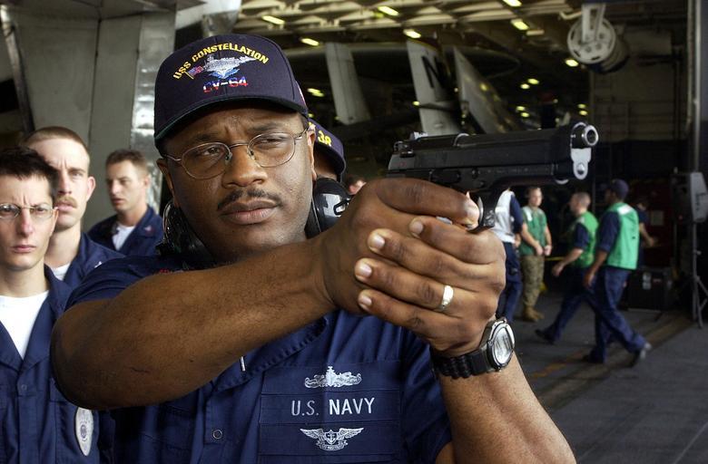 | Keywords: US Navy 021211-N-4142G-015 proper aiming technique during 9mm weapons qualifications.jpg en At sea aboard USS Constellation CV 64 Dec 11 2002 -- Master-at Arms First Class Derrick Vaughn demonstrates proper aiming technique during 9mm weapons qualifications Constellation is on a regularly scheduled six-month deployment conducting missions in support of Operation Enduring Freedom U S Navy photo by Photographer s Mate 2nd Class Felix Garza Jr RELEASED 2002-12-11 021211-N-4142G-015 Navy http //www navy mil/view_image asp id 3720 U S Navy photo by Photographer s Mate 2nd Class Felix Garza Jr PD-USGov-Military-Navy Aboard USS Constellation CV-64 Master-at-arms Photographs by Felix Garza Jr |