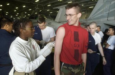 | Keywords: US Navy 030106-N-4142G-006 Lieutenant Erika Walker of San Diego, CA. administers Aviation Ordinanceman Second Class Darrin Anderson of Plainfield, IL. the first shot of Bacillusanthracis to help build his immune system to Anthr.jpg en At sea aboard USS Constellation CV 64 Jan 6 2003 - Lt Erika Walker administers Aviation Ordnanceman 2nd Class Darrin Anderson the first shot of Bacillusanthracis to help build his immune system to Anthrax Constellation is on a regularly scheduled six-month deployment conducting combat missions in support of Operation Enduring Freedom U S Navy photo by Photographer s Mate 2nd Class Felix Garza Jr RELEASED 2003-01-06 030106-N-4142G-006 Navy http //www navy mil/view_image asp id 3939 U S Navy photo by Photographer s Mate 2nd Class Felix Garza Jr PD-USGov-Military-Navy Aboard USS Constellation CV-64 People being vaccinated January 2003 photographs Photographs by Felix Garza Jr |