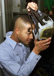 | Keywords: US Navy 030116-N-9109V-001 Operation Specialist 2nd Class Darien O'Neal prepares to check his Gas Mask (MCU-2-P) for a proper seal.jpg en At sea aboard USS Saipan LHA 2 Jan 16 2003 -- Operation Specialist 2nd Class Darien O'Neal prepares to check his Gas Mask MCU-2/P for a proper seal Saipan is responding to deployment orders received to support the war on terrorism U S Navy photo by Photographer s Mate Airman Kyle T Voigt RELEASED 2003-01-16 030116-N-9109V-001 Navy http //www navy mil/view_image asp id 4075 U S Navy photo by Photographer s Mate Airman Kyle T Voigt PD-USGov-Military-Navy Aboard USS Saipan LHA-2 Pictures by Photographer's Mate Airman Kyle T Voigt MCU-2/P Protective Mask |