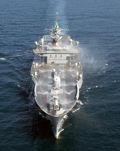 Keywords: US Navy 030205-N-4294K-001 After completing a General Quarters (GQ) drill, the Mount Whitney lights off its onboard Counter Measure Wash Down System (CMWDS).jpg en At sea with USS Mount Whitney LCC/JCC 20 Feb 5 2003 -- After completing a General Quarters GQ drill the Mount Whitney lights off its onboard Counter Measure Wash Down System CMWDS The CMWDS is used to help the ship combat a Chemical Biological or Radiological CBR weapons attack Mount Whitney and her embarked Marines are deployed to the Horn of Africa region to participate in Operation Enduring Freedom and the continuing war on terrorism U S Navy photo by Photographer s Mate 2nd Class George Kusner RELEASED 2003-02-05 030205-N-4294K-001 Navy http //www navy mil/view_image asp id 4449 U S Navy photo by Photographer s Mate 2nd Class George Kusner PD-USGov-Military-Navy General views of USS Mount Whitney LCC-20 Watercraft in motion Front views of ships |