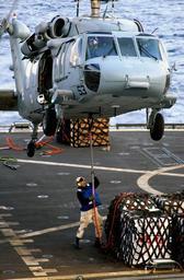 | Keywords: US Navy 030206-N-5821P-009 A Sailor assigned to the combat stores ship USNS San Jose (T-AFS 7) attaches a hoist line to the bottom of an SH-60 ^ldquo,Seahawk^rdquo,.jpg en At sea with USNS San Jose T-AFS 7 Feb 6 2003 -- A Sailor assigned to the combat stores ship attaches a hoist line to the bottom of an MH-60 Knight Hawk helicopter as it prepares to deliver cargo to USS Kitty Hawk CV 63 The Kitty Hawk is forward-deployed to Yokosuka Japan U S Navy photo by Photographer s Mate Airman Jason T Poplin RELEASED 2003-02-06 030206-N-5821P-009 Navy http //www navy mil/view_image asp id 4454 U S Navy photo by Photographer s Mate Airman Jason T Poplin PD-USGov-Military-Navy MH-60S Seahawk Aboard USNS San Jose T-AFS-7 Helihoisting of cargo |