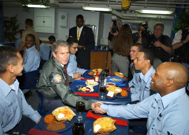 | Keywords: US Navy 030213-N-0874H-004 Presiden Bush has lunch with Sailors aboard USS Philippine Sea.jpg en Aboard USS Philippine Sea CG 58 Feb 13 2002 -- While visiting Naval Station Mayport Fla President George W Bush has lunch with Sailors stationed aboard the guided missile cruiser USS Philippine Sea During a speech earlier in the day President Bush thanked Sailors and their families for their sacrifices and the continuing effort with the global war on terror The United States Navy carries the might and the mission of America to the farthest parts of the world the President said U S Navy Photo by Photographer s Mate 2nd Class Chuck Hill RELEASED 2002-02-13 030213-N-0874H-004 Navy http //www navy mil/view_image asp id 4524 U S Navy Photo by Photographer s Mate 2nd Class Chuck Hill PD-USGov-Military-Navy Aboard USS Philippine Sea CG-58 George W Bush in 2003 Handshakes involving the military |